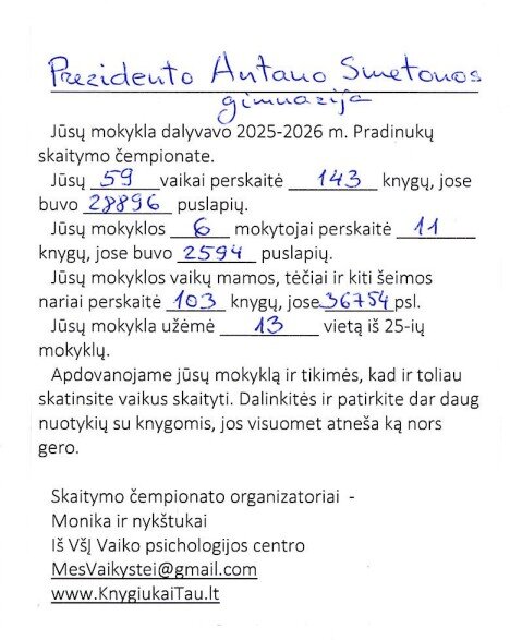 Šis čempionatas dar kartą priminė, kad knyga – tai raktas į begalinį žinių, vaizduotės ir patirčių pasaulį. Tikimės, kad skaitymo džiaugsmas lydės mūsų mokinius ir toliau, o kitais metais dar daugiau bendruomenės narių įsitrauks į šią prasmingą iniciatyvą.