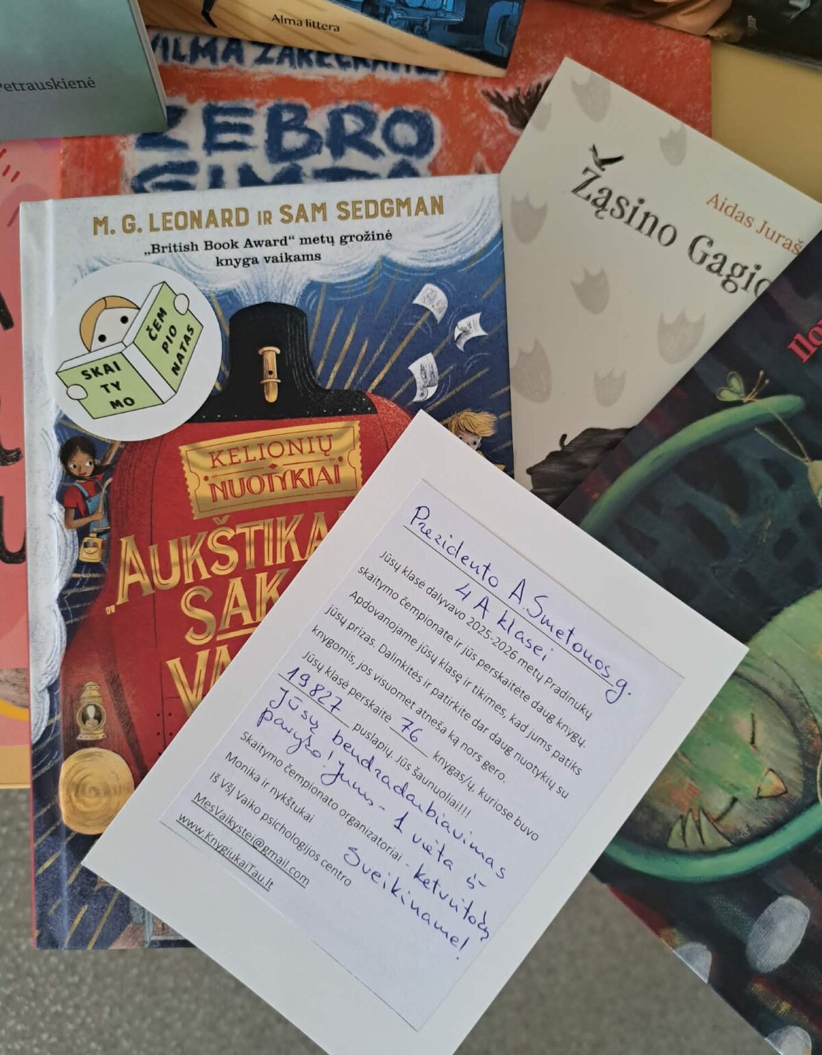 Ypatingi sveikinimai skiriami 4a klasei ir jos mokytojai Rimai Latkauskaitei – ši klasė buvo apdovanota kaip daugiausiai knygų bei knygos puslapių perskaičiusi klasė. Tai įkvepiantis pavyzdys, kaip bendras darbas ir motyvacija veda į puikius rezultatus.