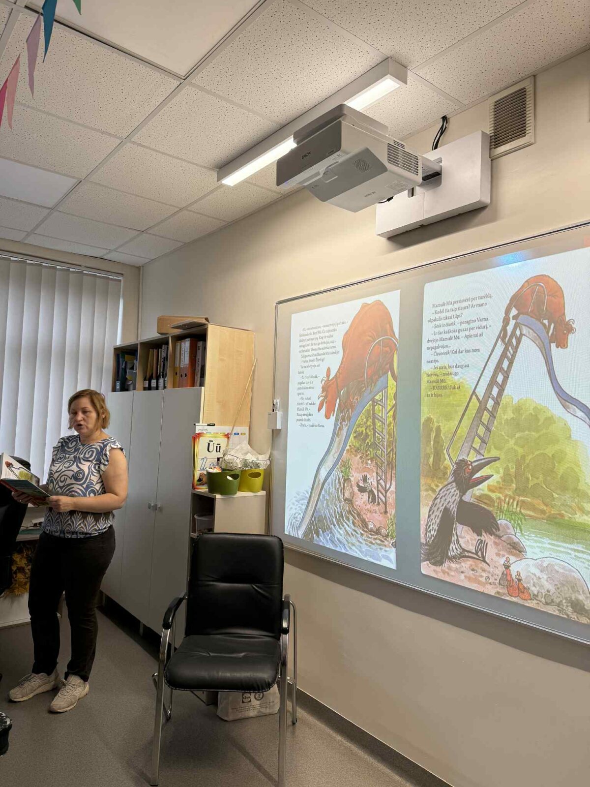 Bibliotekininkė Vilma pradėjo pamoką skaitydama J. Wieslander juokingą pasakojimą "Mamulė Mū čiuožinėja nuo čiuožyklos". Mokiniai klausėsi apie žaviąją Mamulę Mū ir jos išdaigininkę draugę Varną. Skambantis juokas klasėje parodė, kad pasakojimas tikrai patiko!
